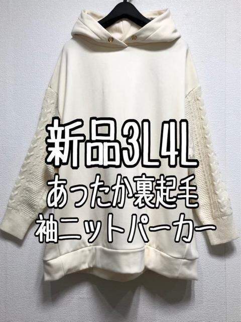 新品☆3L4L♪白系♪あったか裏起毛キレイ見えパーカー×袖ニット☆w991