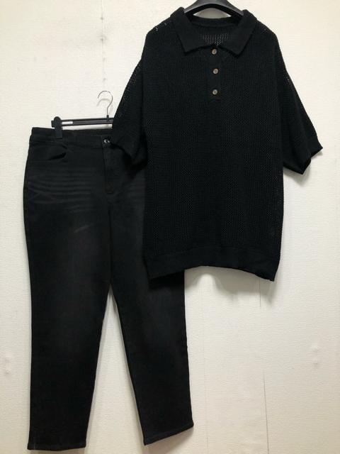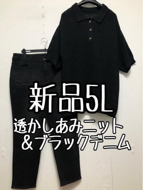新品☆5L♪黒系♪透かし編み5分袖ニット&裏起毛デニム☆z852
