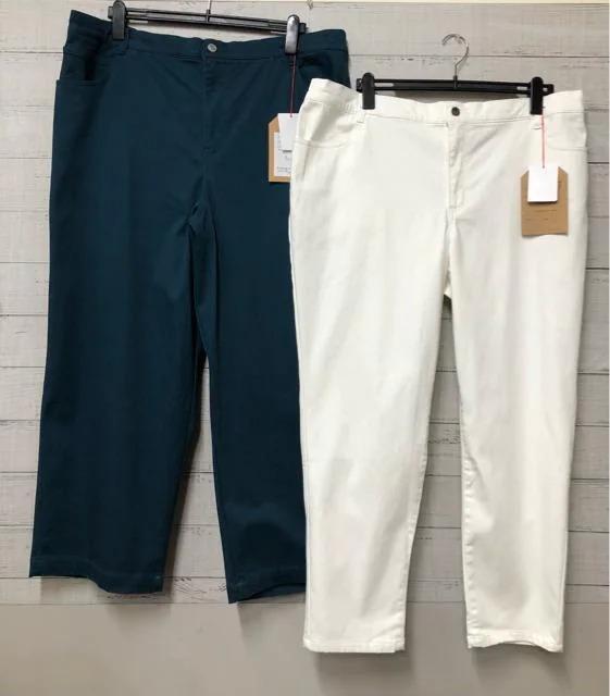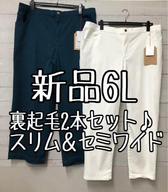 新品☆6L♪裏起毛パンツ2本セット♪白スリム&緑セミワイドパンツ♪☆e585