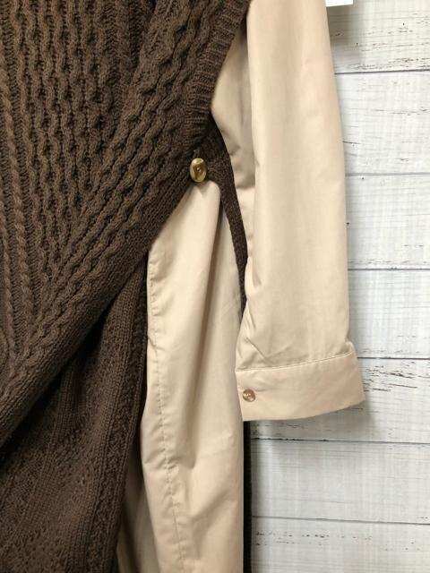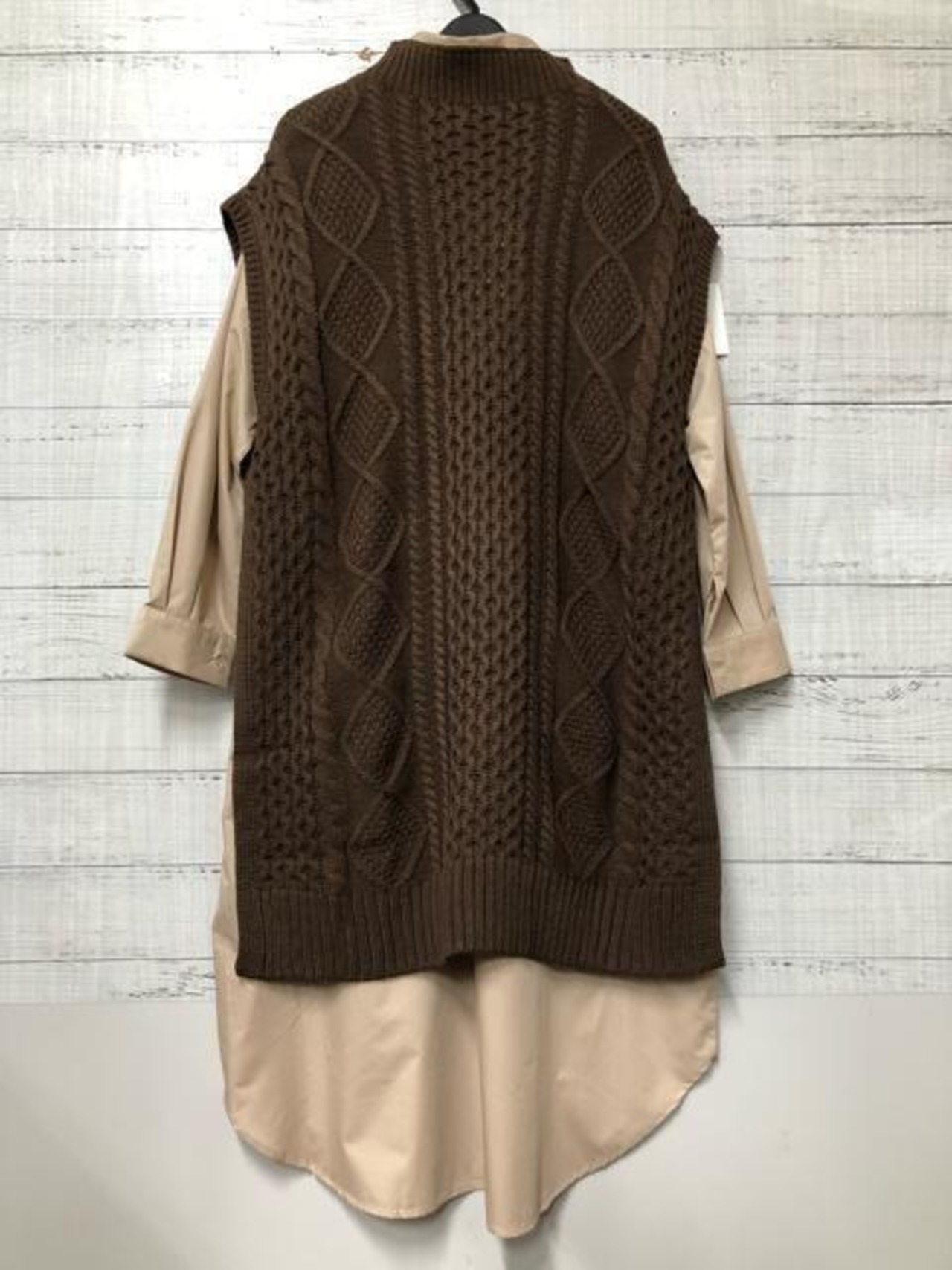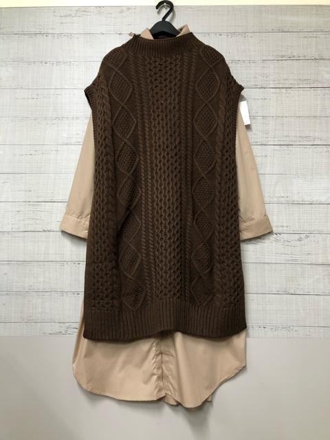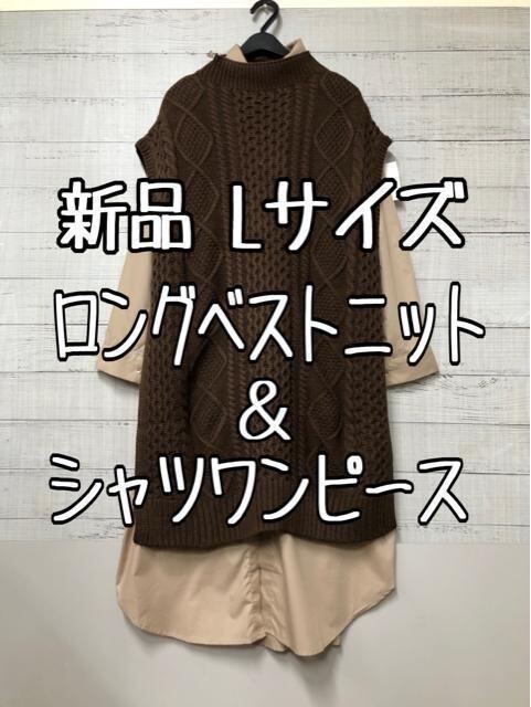 新品☆Lブラウン系♪ロングシャツワンピース×ロングニットベストおしゃれ☆e910
