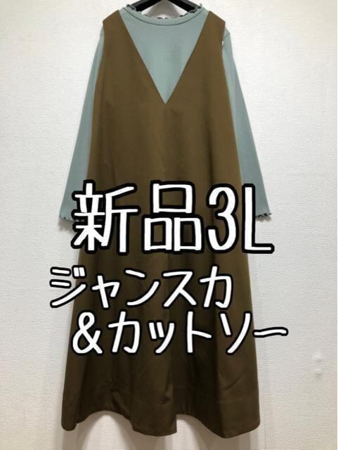 新品☆3L♪グリーン×茶系♪マキシ丈ジャンスカ&カットソーのセット☆u692