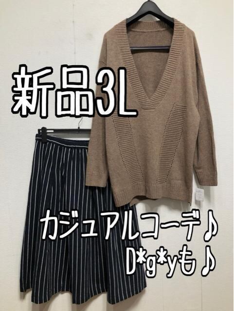 新品☆3L♪ベージュ系♪深Vネックニット&紺系フレアスカート☆z487