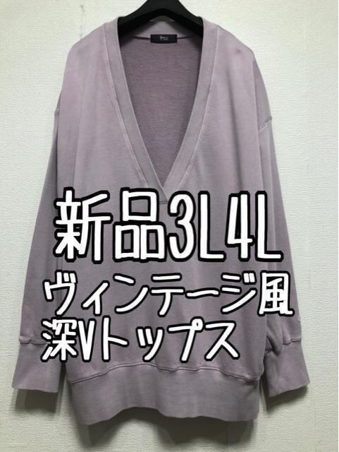 新品☆3L4L♪ピンク系♪ヴィンテージ風おしゃれ深Vトップス☆w983
