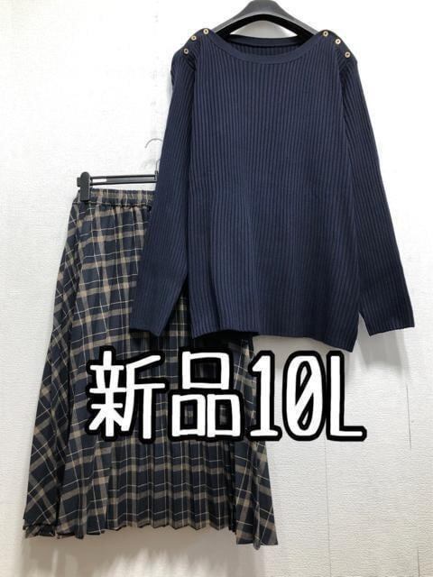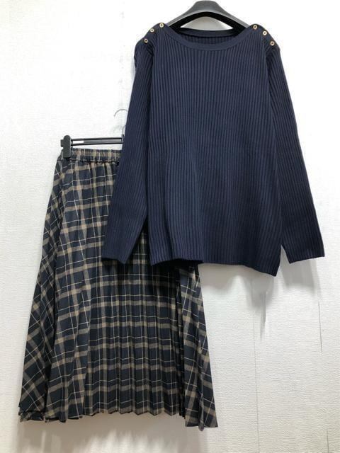 新品☆10L♪紺系ボートネックリブニット&チェック柄プリーツスカート☆r244