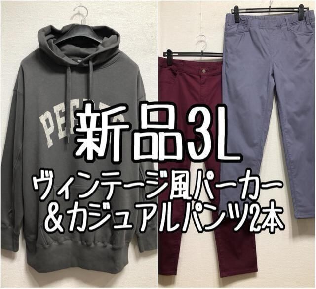 新品☆3L♪ヴィンテージ風チュニックパーカー&カジュアルパンツ2本☆b199