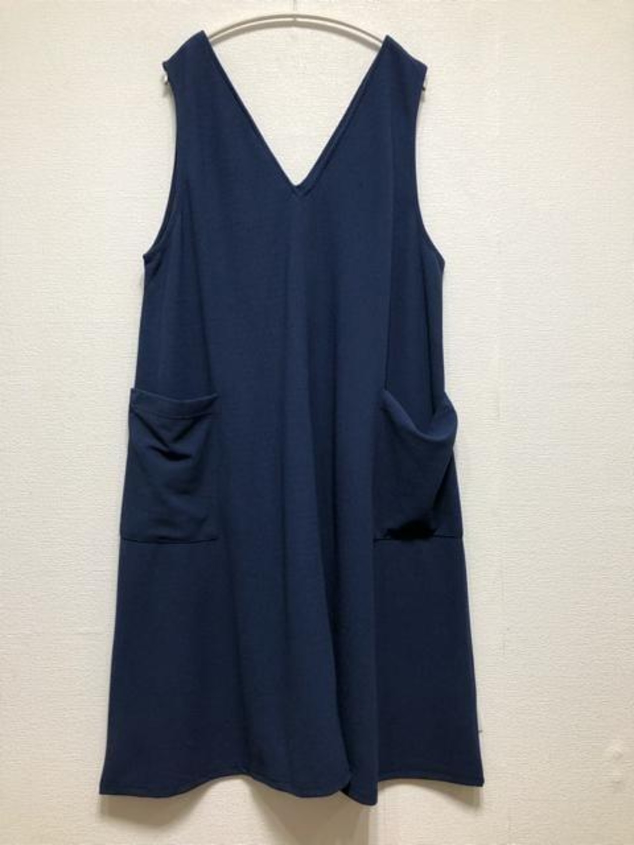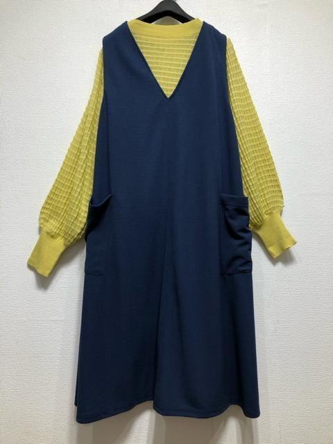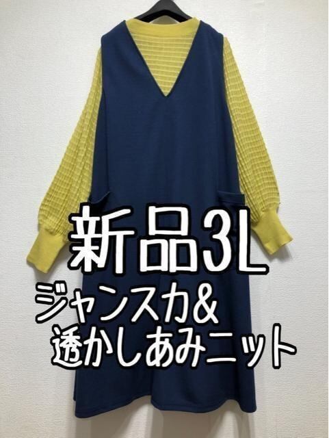 新品☆3L♪紺系ストレッチきれいジャンスカ&黄色透かし編みニット☆u695