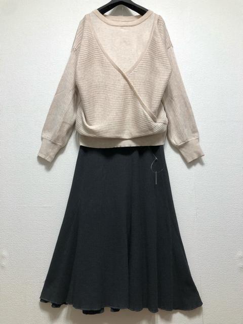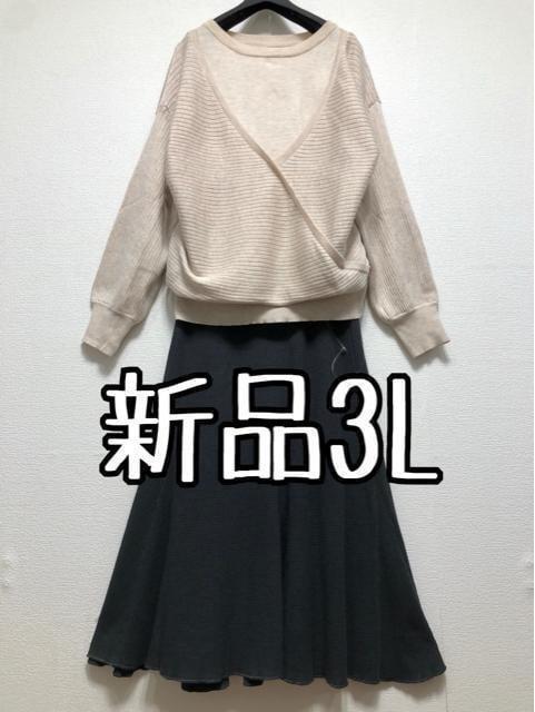 新品☆3L♪ベージュ×黒系♪重ね着風ニット&マキシ丈スカート☆w986