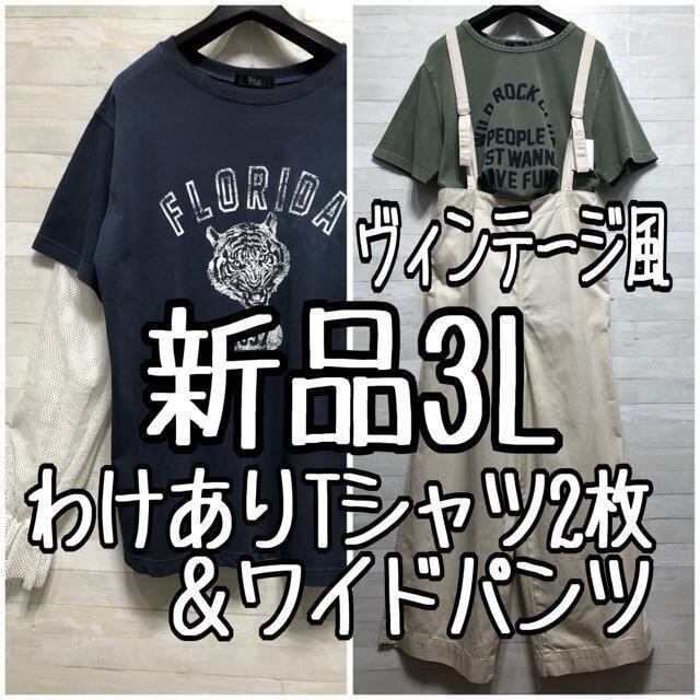 新品☆3L♪ヴィンテージ風Tシャツ2枚、ワイドパンツサロペット♪☆x713