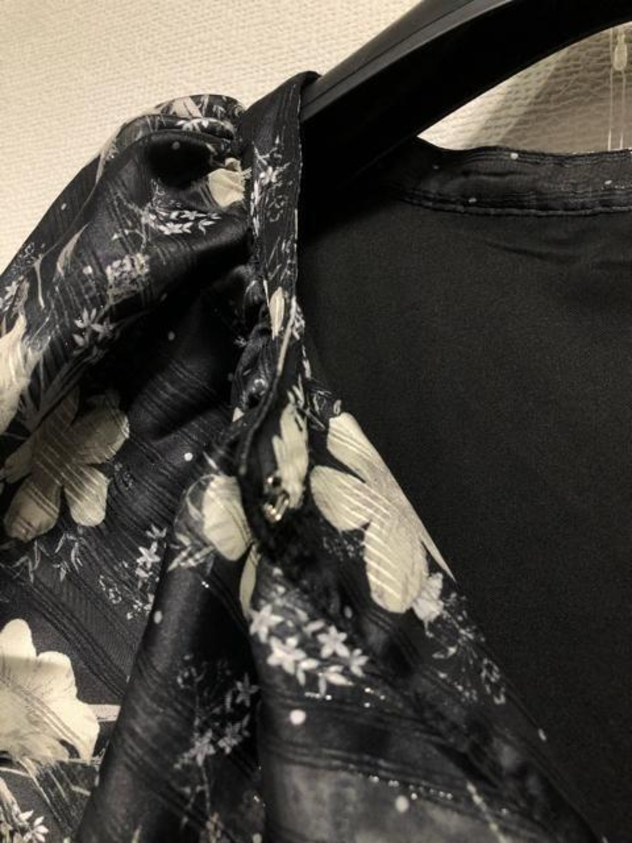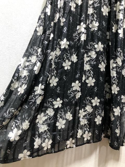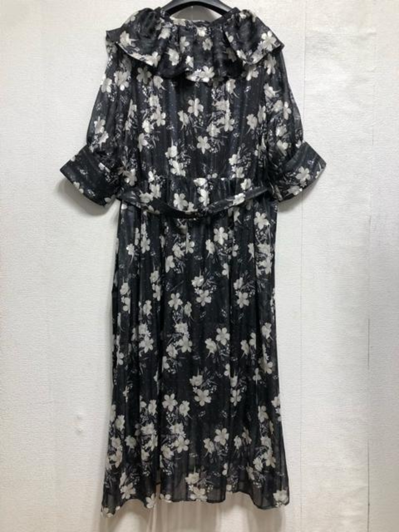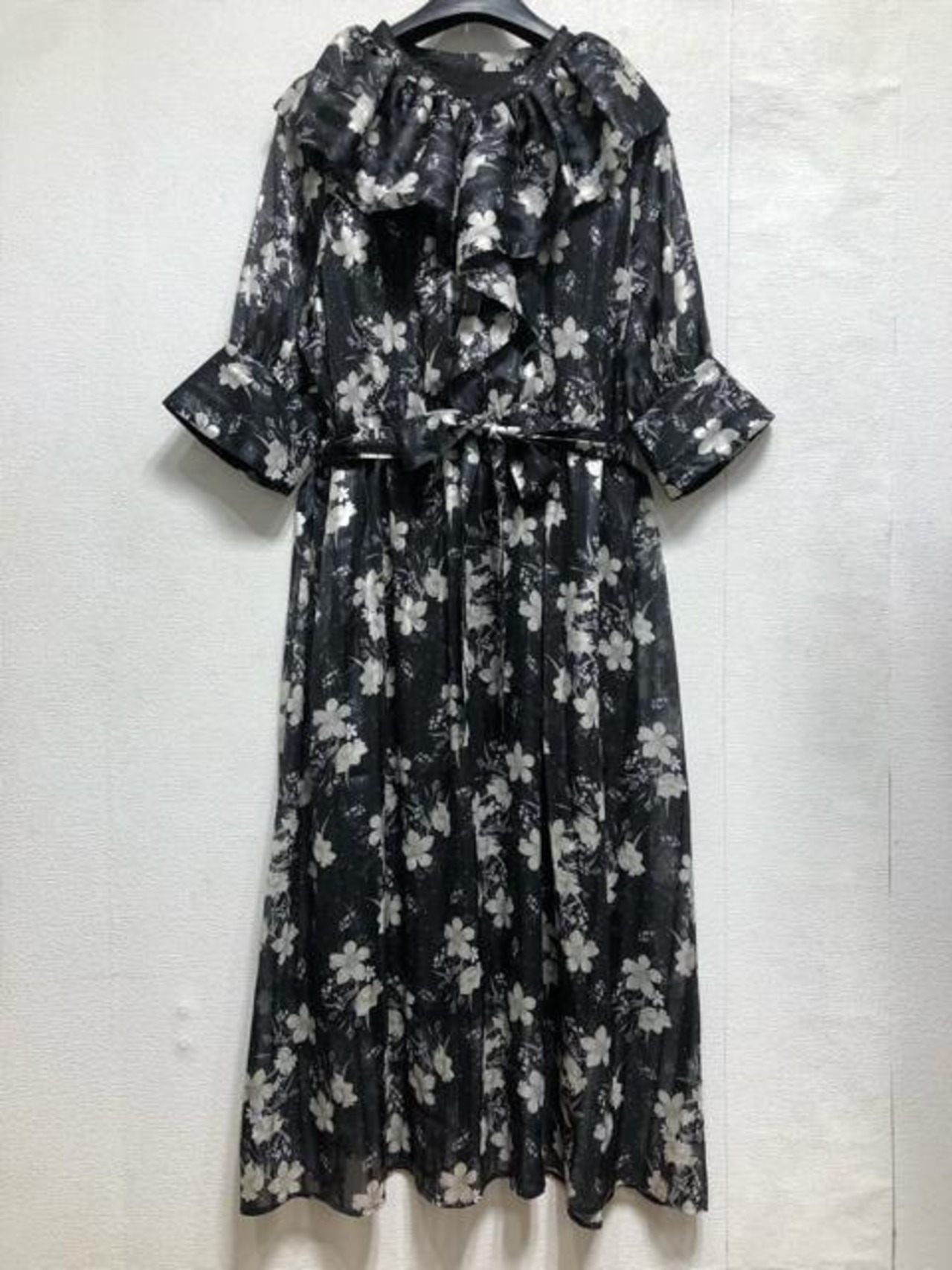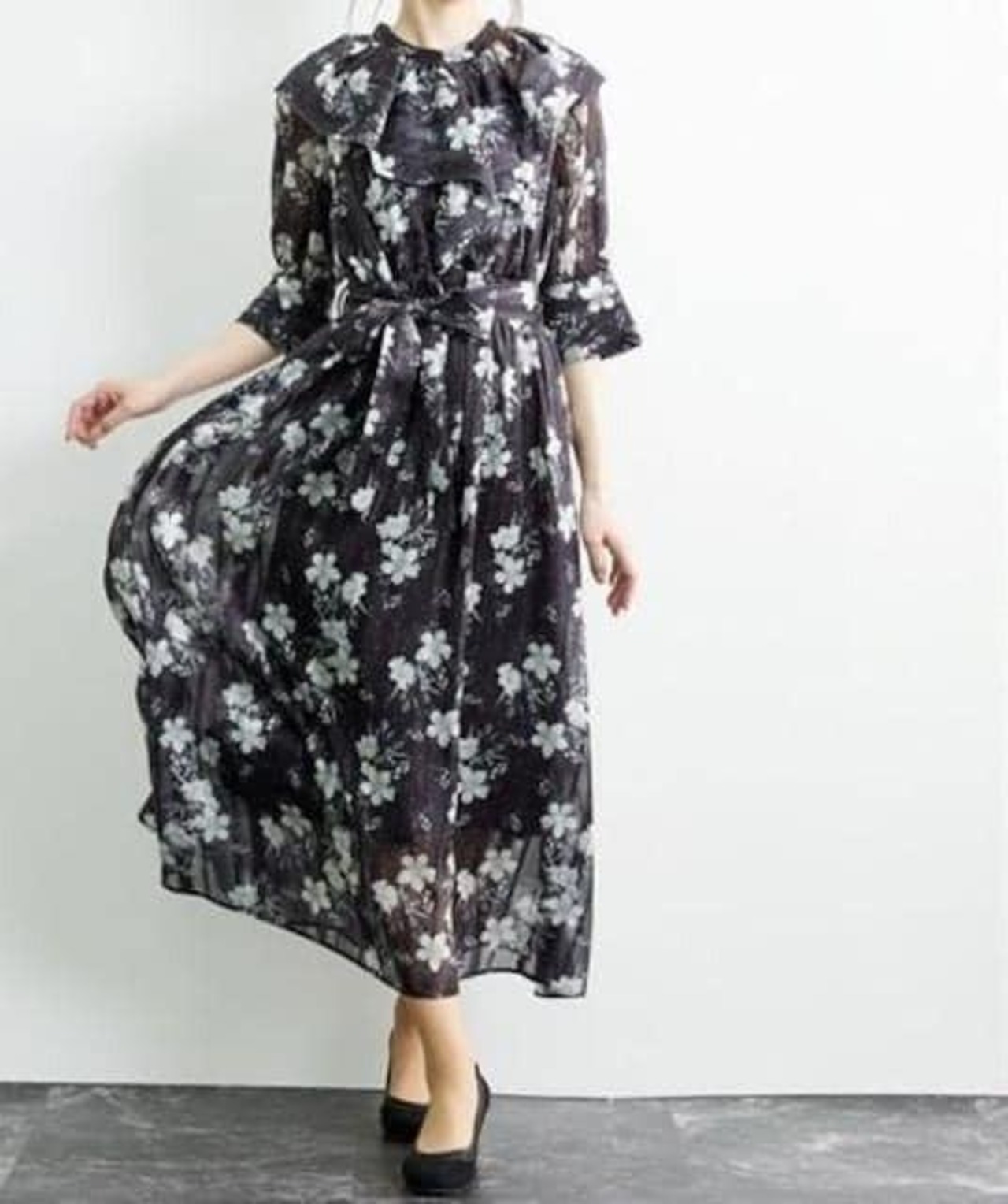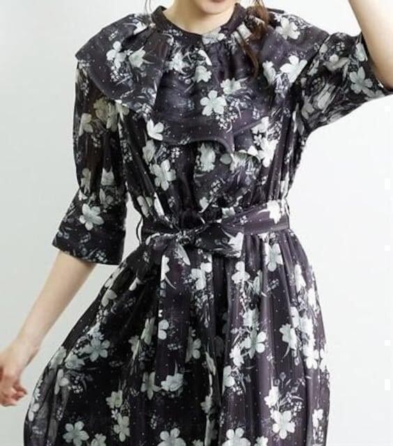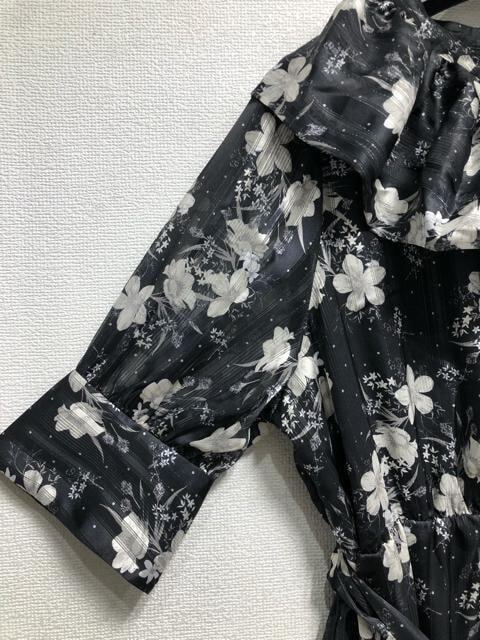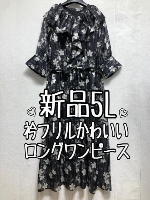新品☆5L黒系♪衿フリルかわいい花柄プリント♪マキシ丈ワンピース☆b292
