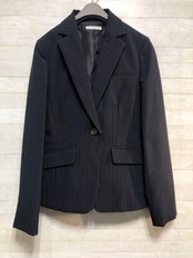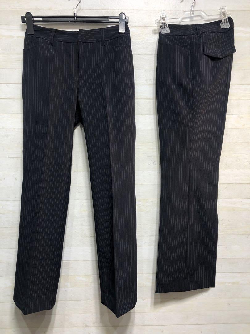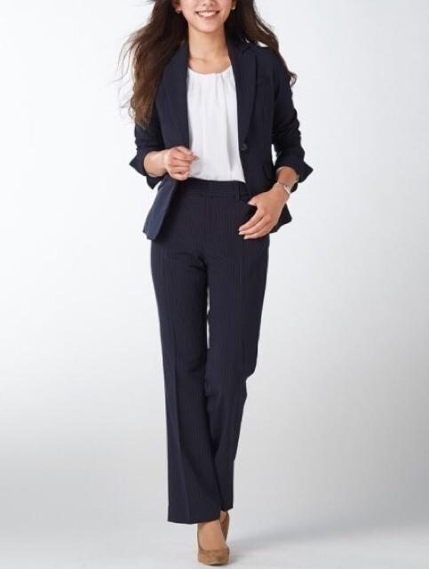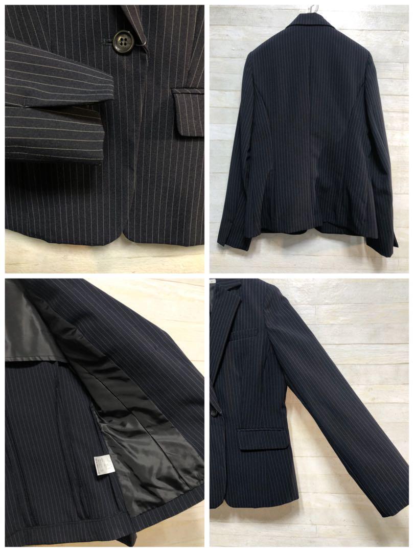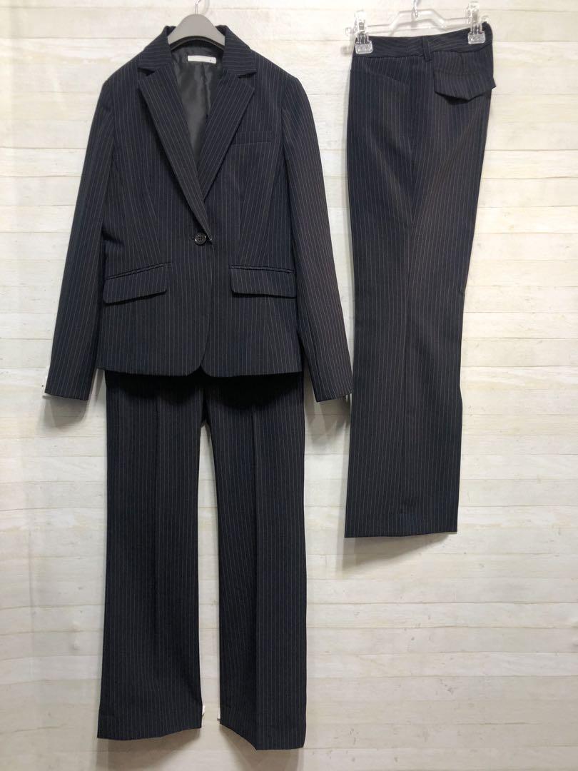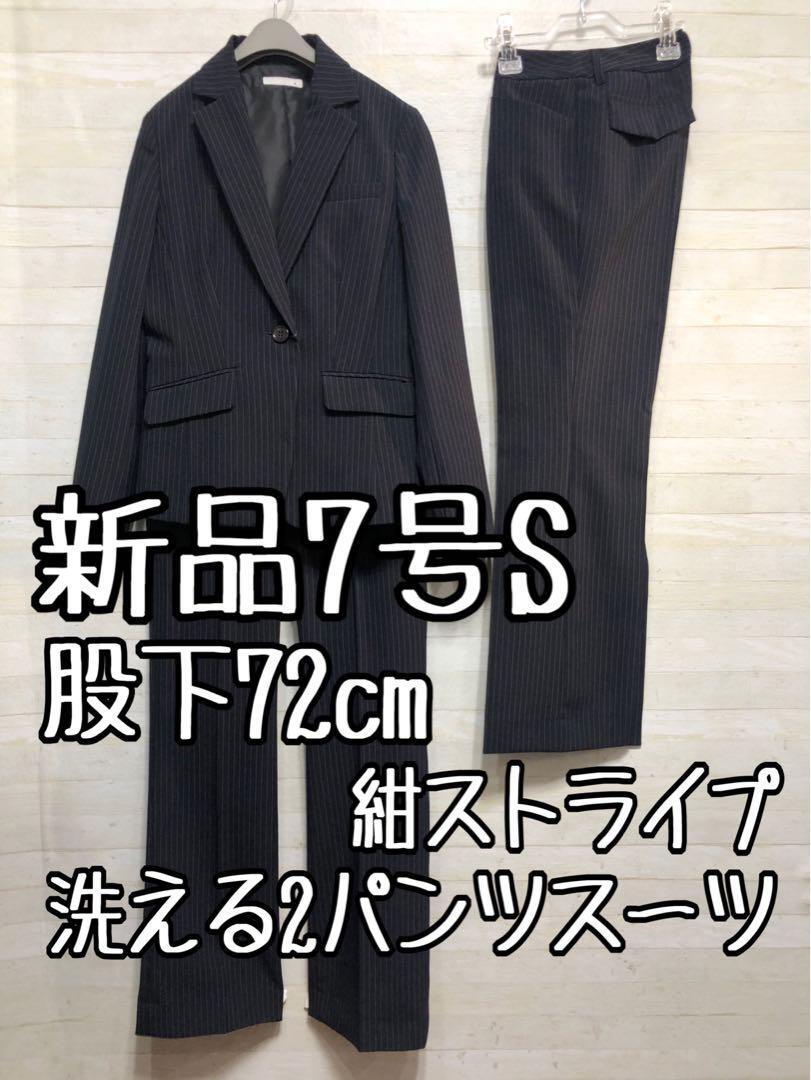新品☆7号S♪洗える紺色×グレー系ストライプ2パンツスーツ♪〇G343